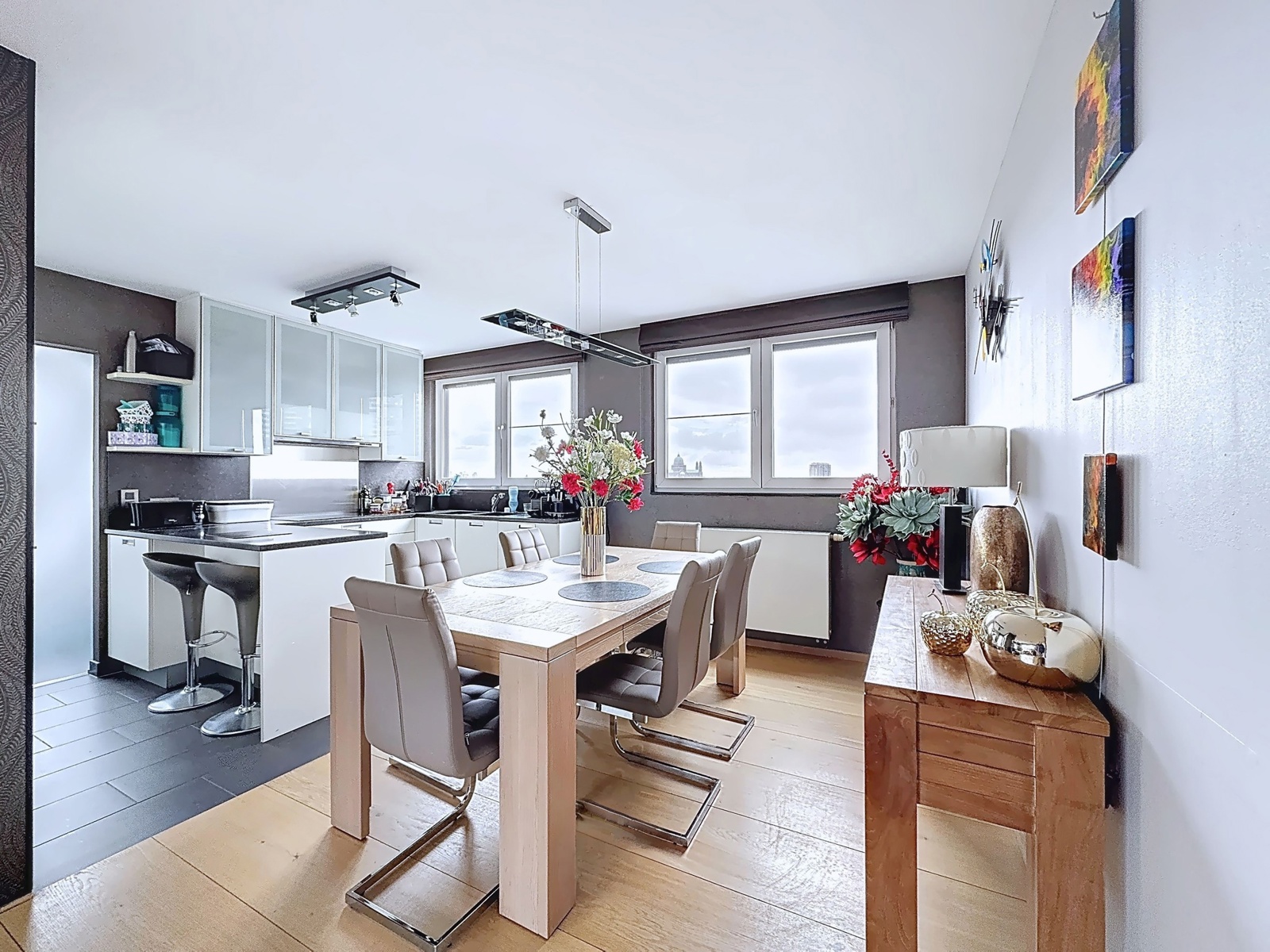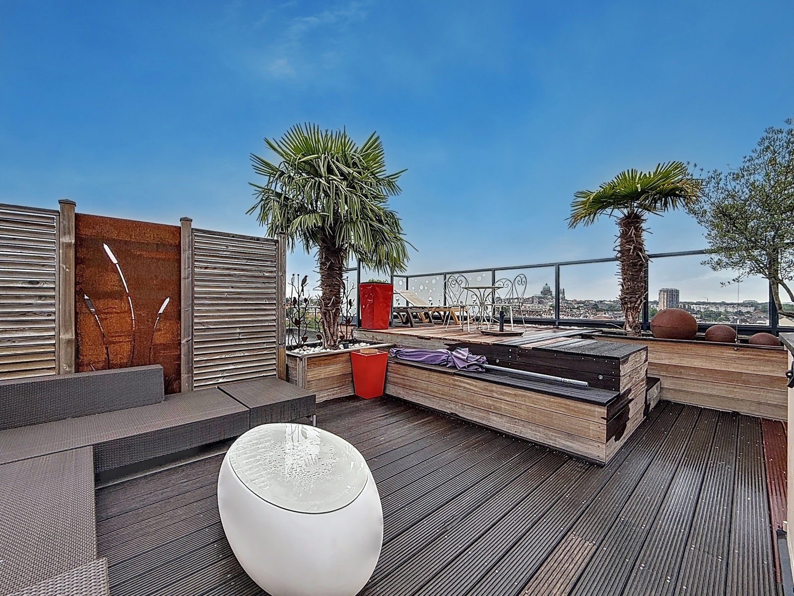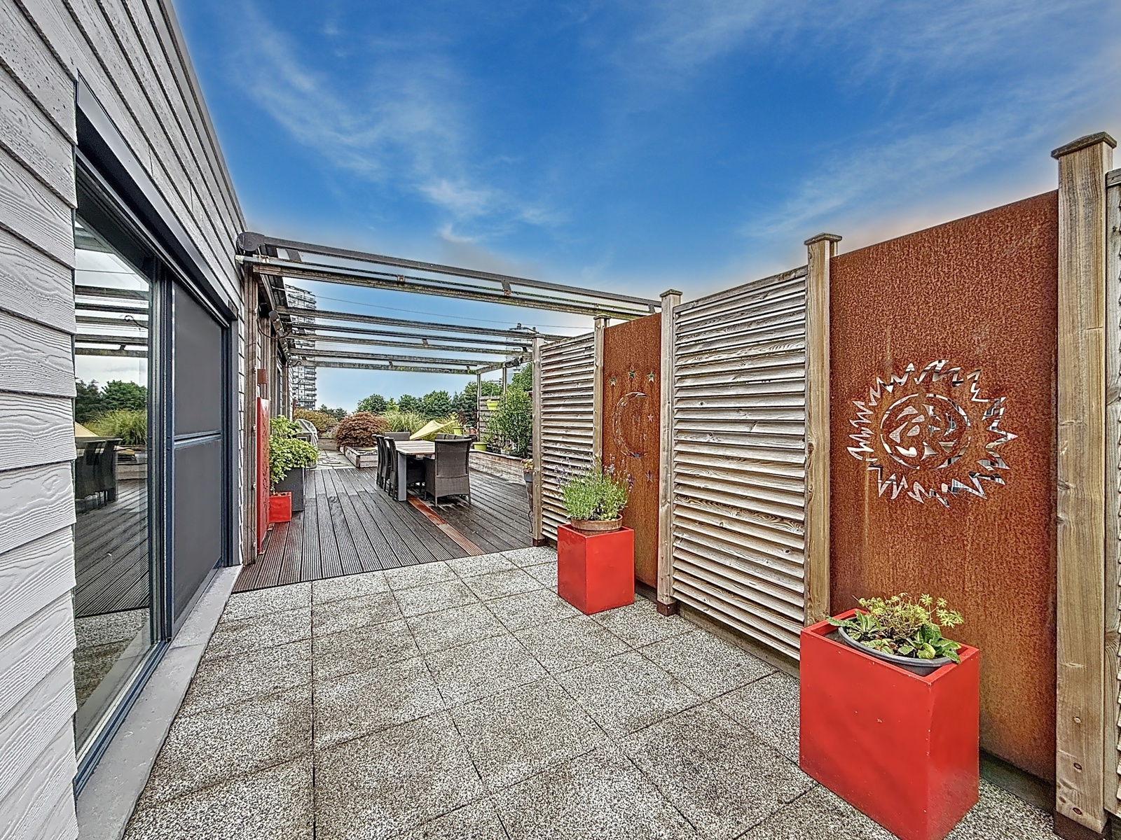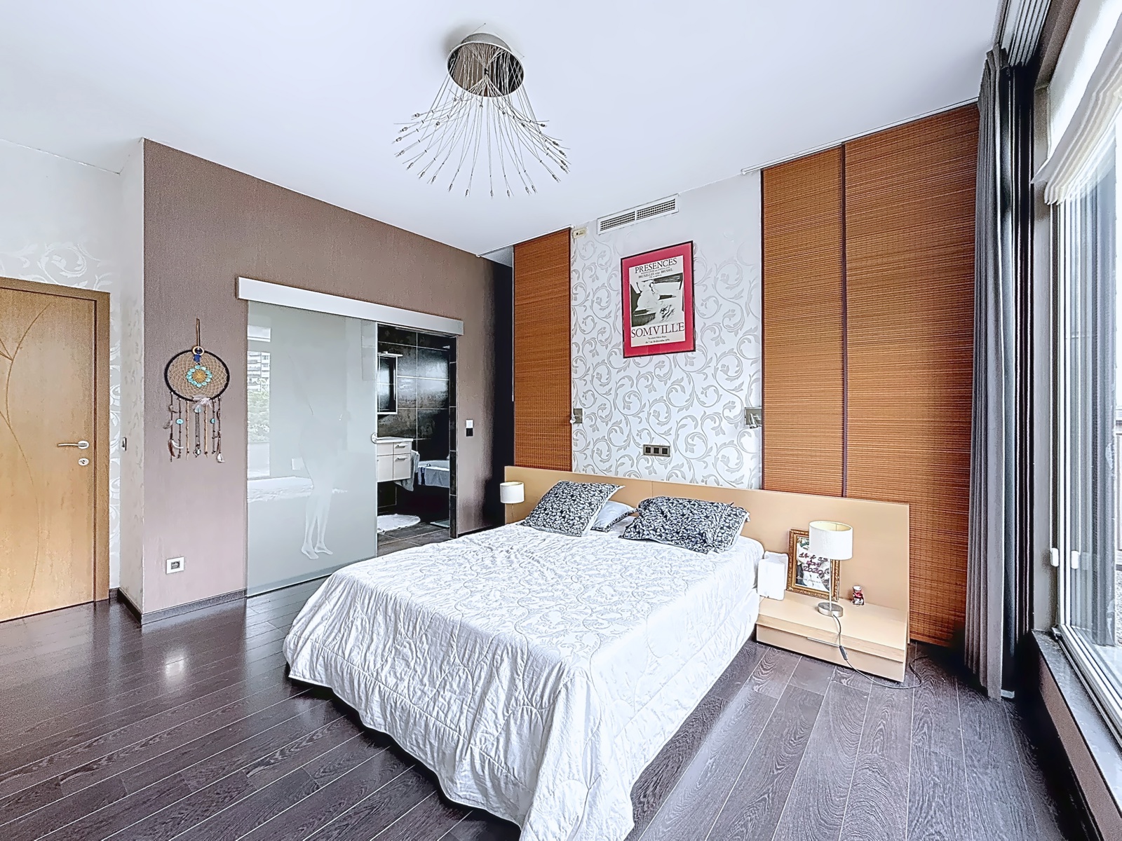 Located in a luxury building constructed in 2007, this magnificent penthouse captivates with its spaciousness, brightness, and high-end finishes. All living areas open onto a huge 175 m² terrace, a real highlight of this rare property, ideal for relaxing and enjoying convivial moments outdoors. The apartment features a spacious, light-filled living room with a gas fireplace and air conditioning, providing a warm and comfortable living environment. The fully equipped ATAG kitchen blends perfectly into the living space, combining aesthetics and functionality. The sleeping area features four bedrooms, including an elegant master suite with a private bathroom and a large 9 m² dressing room. An additional shower room and a separate toilet complete the space. A large laundry room with spaces for a washing machine and dryer ensures optimal daily comfort. The property has a category D PEB certificate, and the electrical system is compliant until 2045. The monthly charges are €206.12. Two optional garages are available for €35,000 (23m² n° 19) and €40,000 (27m² n°20). This exceptional property offers a unique living environment, combining modern comfort, generous spaces, and unobstructed views. Don't delay!